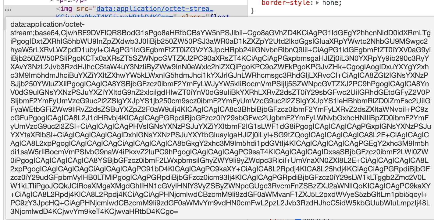 이렇게 data 형식으로 base64인코딩되어있다. 디코딩 해보면, main화면의 html코드임을 알 수 있다.