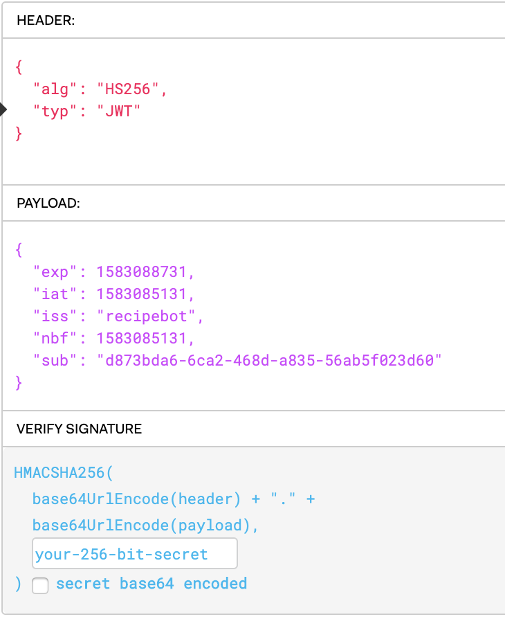 JWT는 각 부분의 내용을 Base64인코딩 한 뒤 "." 으로 연결한다. 따라서 이 형식을 맞춰서 임의로 토큰을 만들 수 있다.