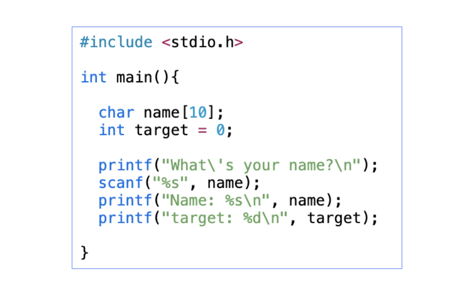 name이라는 char형 10byte배열과 target이라는 int형 변수가 선언되어있습니다.