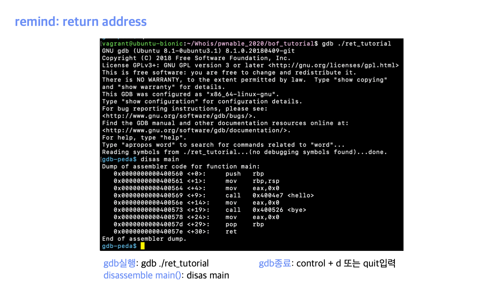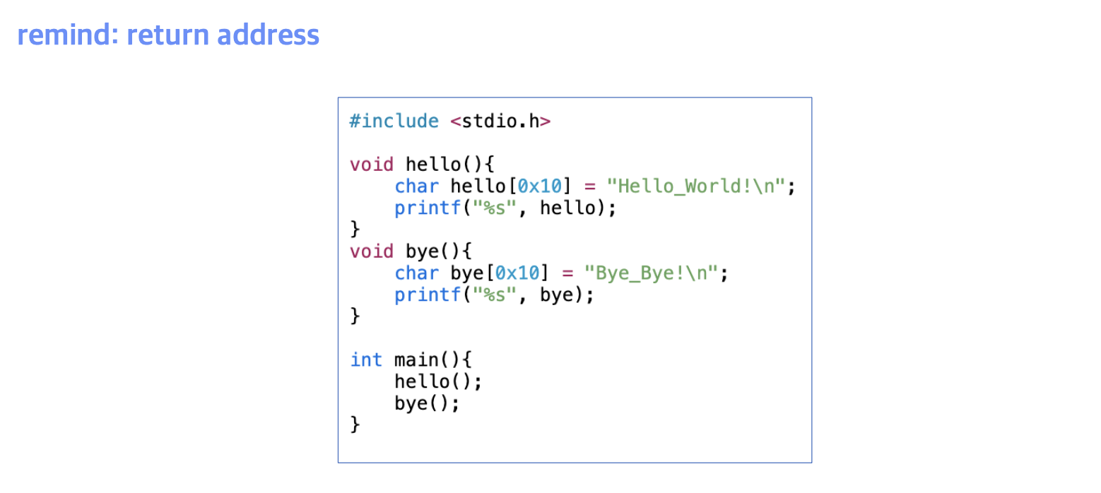 이처럼 return address는 함수가 호출될 때 생성되며, 함수가 종료되었을 때 돌아올 주소를 담고있습니다.