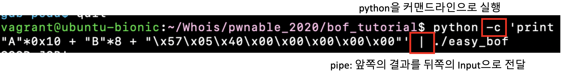 | 는 리눅스의 pipe기능으로 앞쪽 실행결과를 뒤쪽의 input으로 전달하는 역할을 합니다. 따라서 앞의 Python에서 print된 결과를 easy_bof의 input으로 전달되기 때문에 scanf로 전달되는 것 입니다.