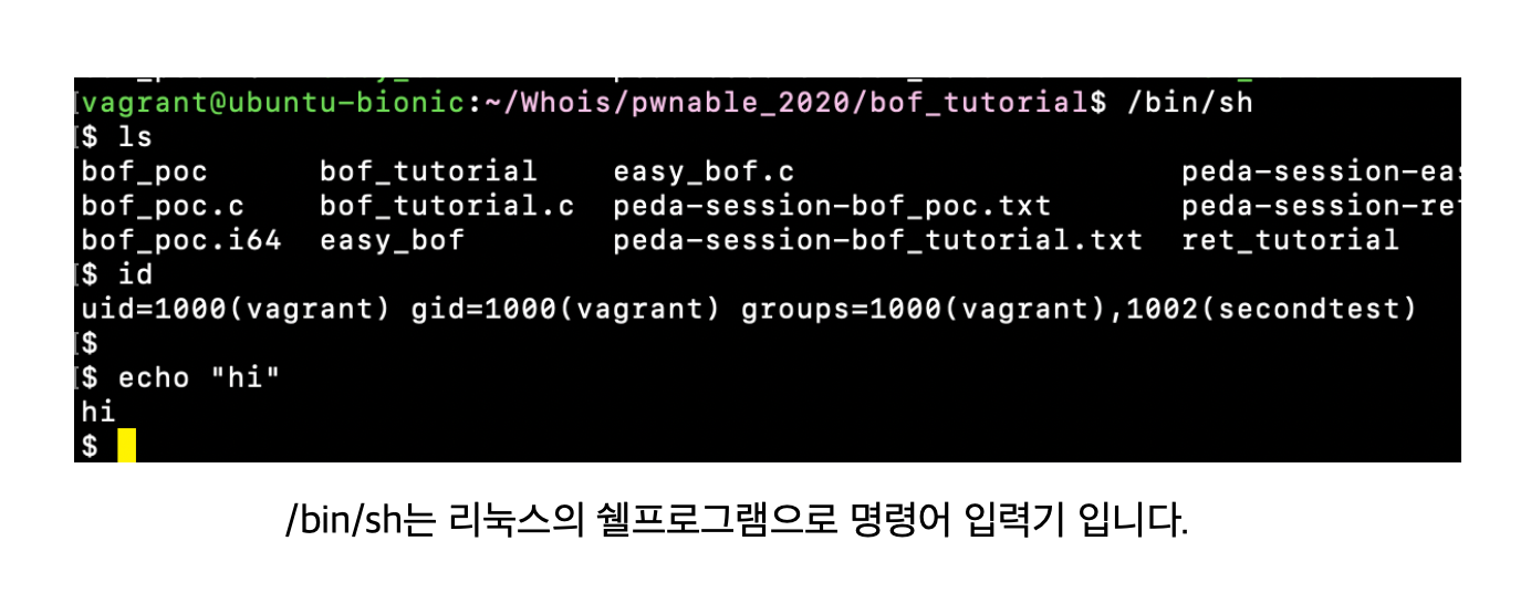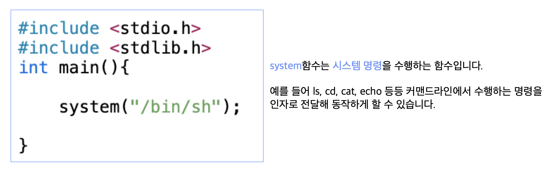 system함수의 인자로 전달한 /bin/sh는 리눅스의 쉘프로그램으로 명령어를 입력하고 결과를 출력하는 명령어 입력기 입니다.