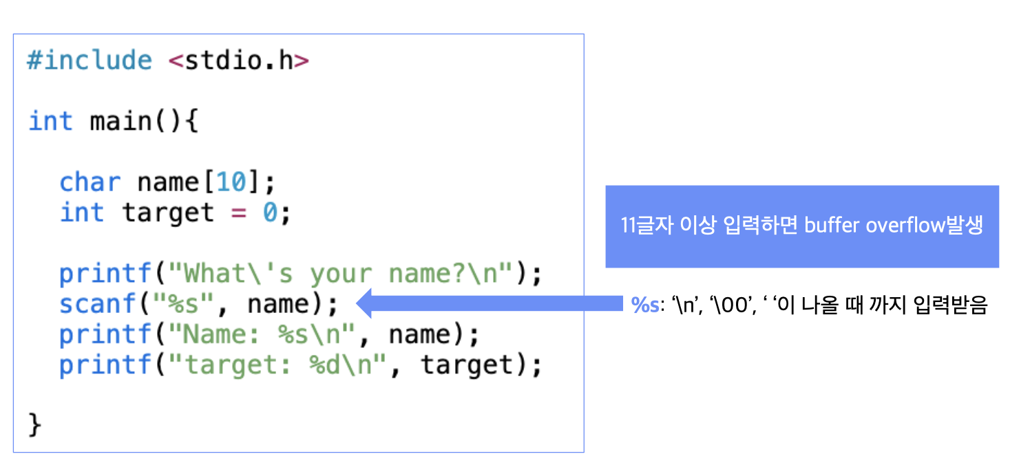 따라서 name은 10칸짜리 배열인데, 그 이상 입력을 받을 수 있는 상황입니다.