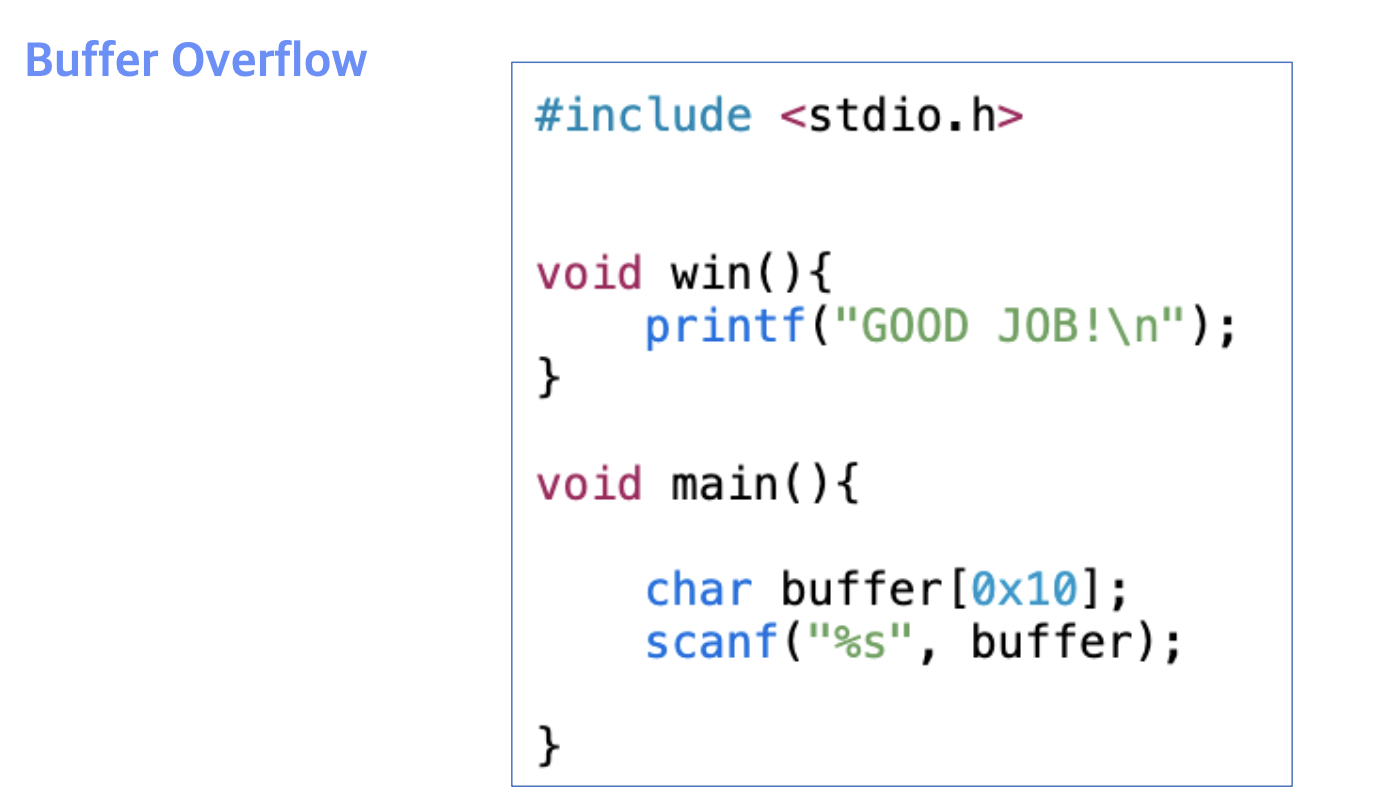 간단한 예시를 통해 버퍼오버플로우에 대해서 알아보겠습니다.