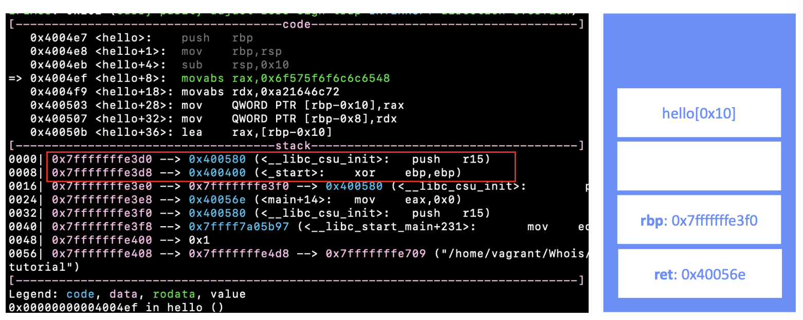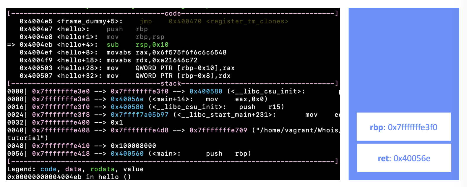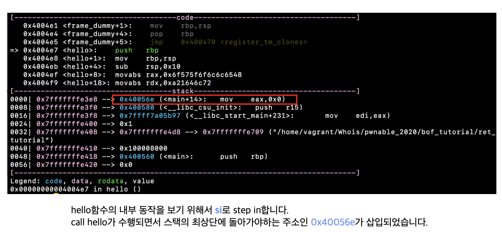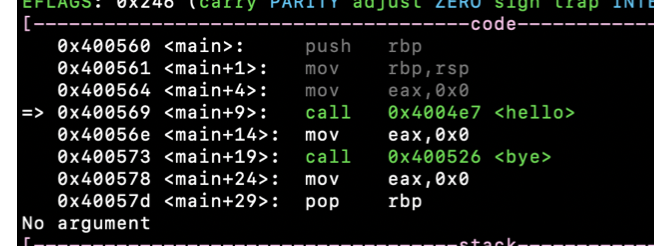 call hello가 수행되면, stack에 0x40056e가 push되는 것을 확인할 수 있습니다.