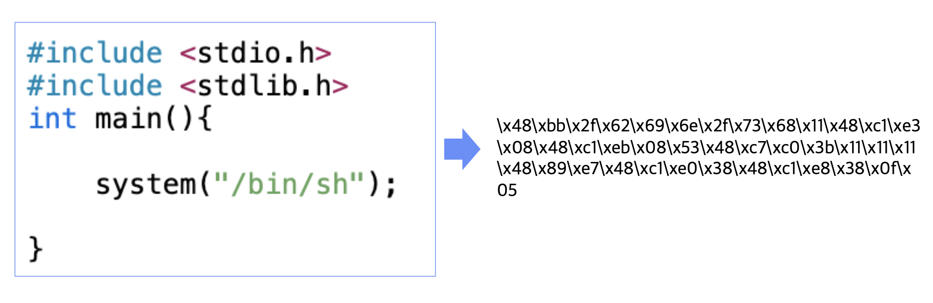 쉘코드란 방금처럼 쉘을 실행하는 코드를 기계어로 번역한 결과입니다.