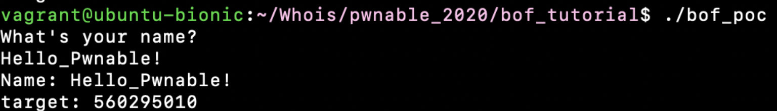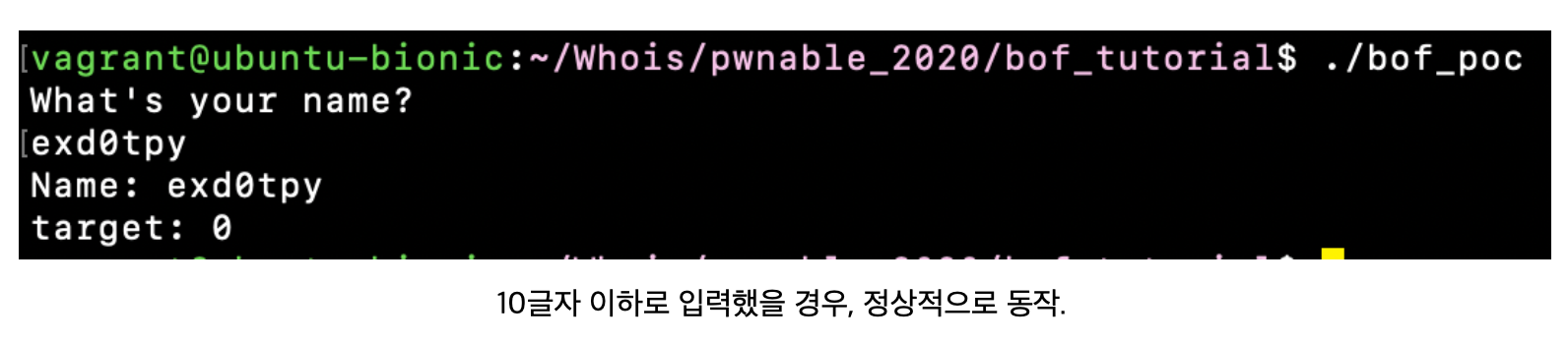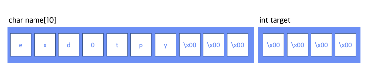 입력했던 글자중 10글자까지는 name에 잘 저장되지만, 11번째 글자부터는 target의 메모리를 침범하는 것을 볼 수 있습니다.