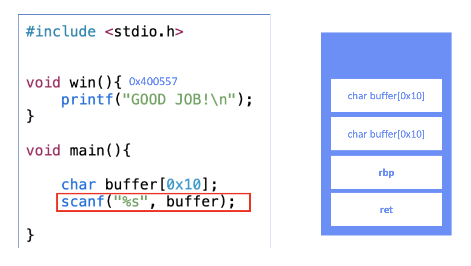 buffer가 0x10byte를 차지하고, 그 아래에는 main함수 호출에 의해 생성된 rbp, ret이 위치하고 있습니다.