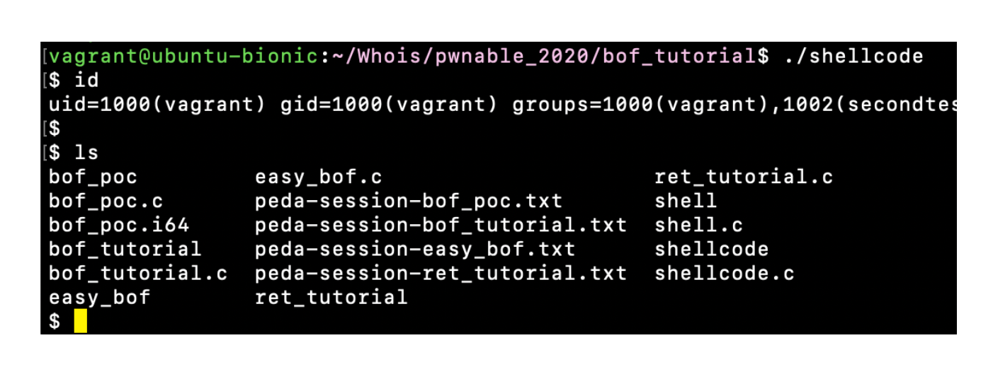 컴파일한 shellcode를 실행해보면 쉘이 실행되는 것을 볼 수 있습니다.