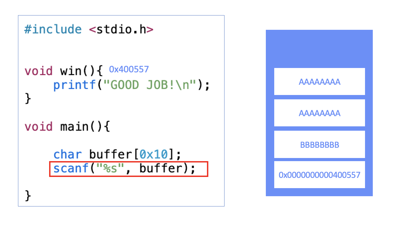 scanf가 %s로 문자열을 입력받고 있기 때문에, buffer에 0x10이상입력할 수 있습니다.