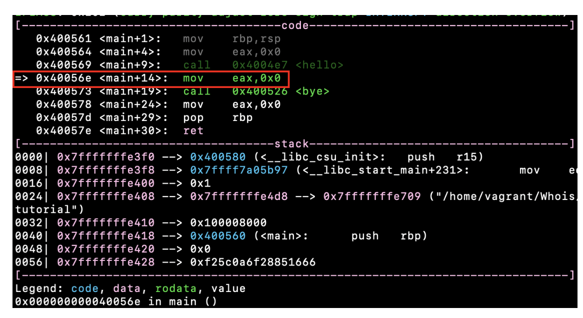 rip를 보면 이전에 설정한 brake point인 0x40056에서 멈춰있는 것을 확인할 수 있습니다.