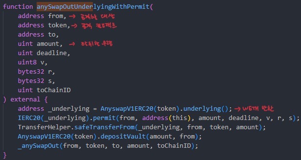 그중 취약점이 존재하는 함수는 anySwapOutUnderlyingWithPermit입니다.